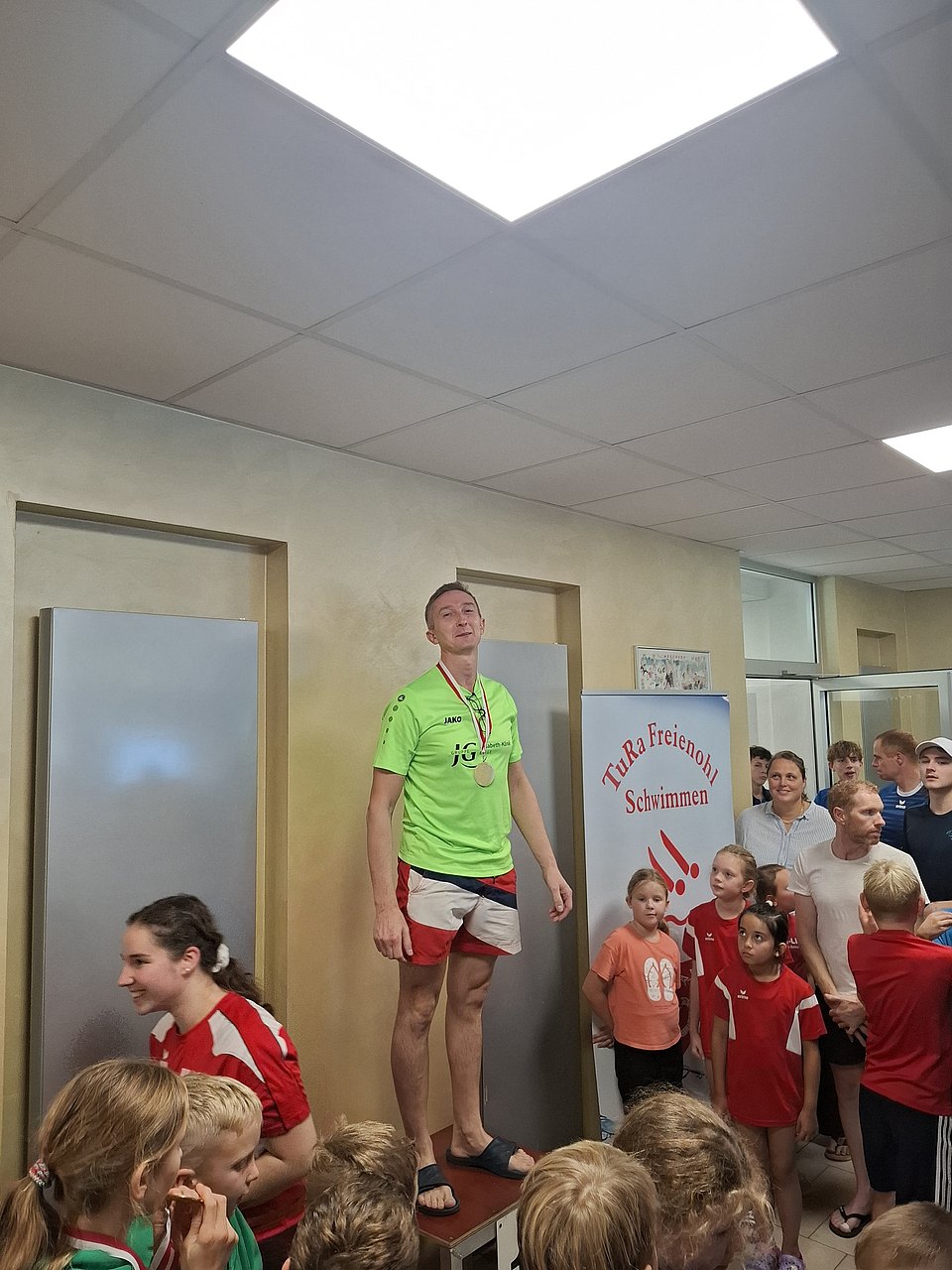 Nur wenige Tage später, am Freitag, den 3. Oktober 2025, ging es für fünf Aktive Wettkampfschwimmer/innen zum Tura Freienohl in das Hallenbad Meschede. Bei insgesamt 123 Teilnehmenden mit 436 Starts erreichte das Team des TuS Velmede-Bestwig hervorragende 13 Medaillen und 11 persönliche Bestzeiten, sehr zur Freude von Trainer und sportlichem Leiter Martin Vetter.
