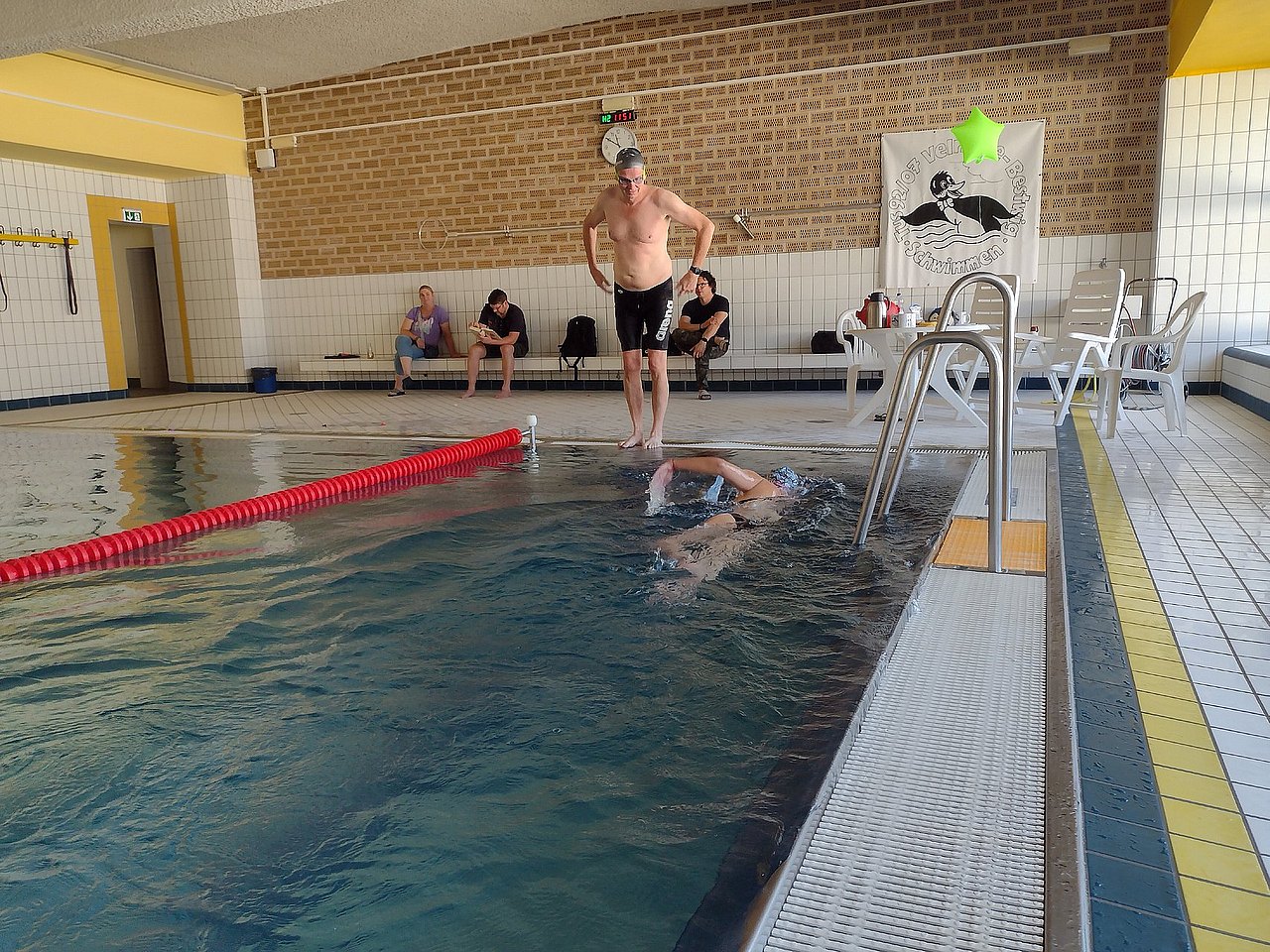 Einteilen konnte man sich seine Zeiten vorab selbst. So schwammen die kleinsten in einem Rahmen von 10 Minuten ca. 8 Bahnen. Erwachsene und Wettkampfschwimmer, die 2 Stunden und länger im Wasser waren bis zu 400 Bahnen. Auch zum Spaß und zu Unterstützung wurde auf den Nebenbahnen noch mit geschwommen.
