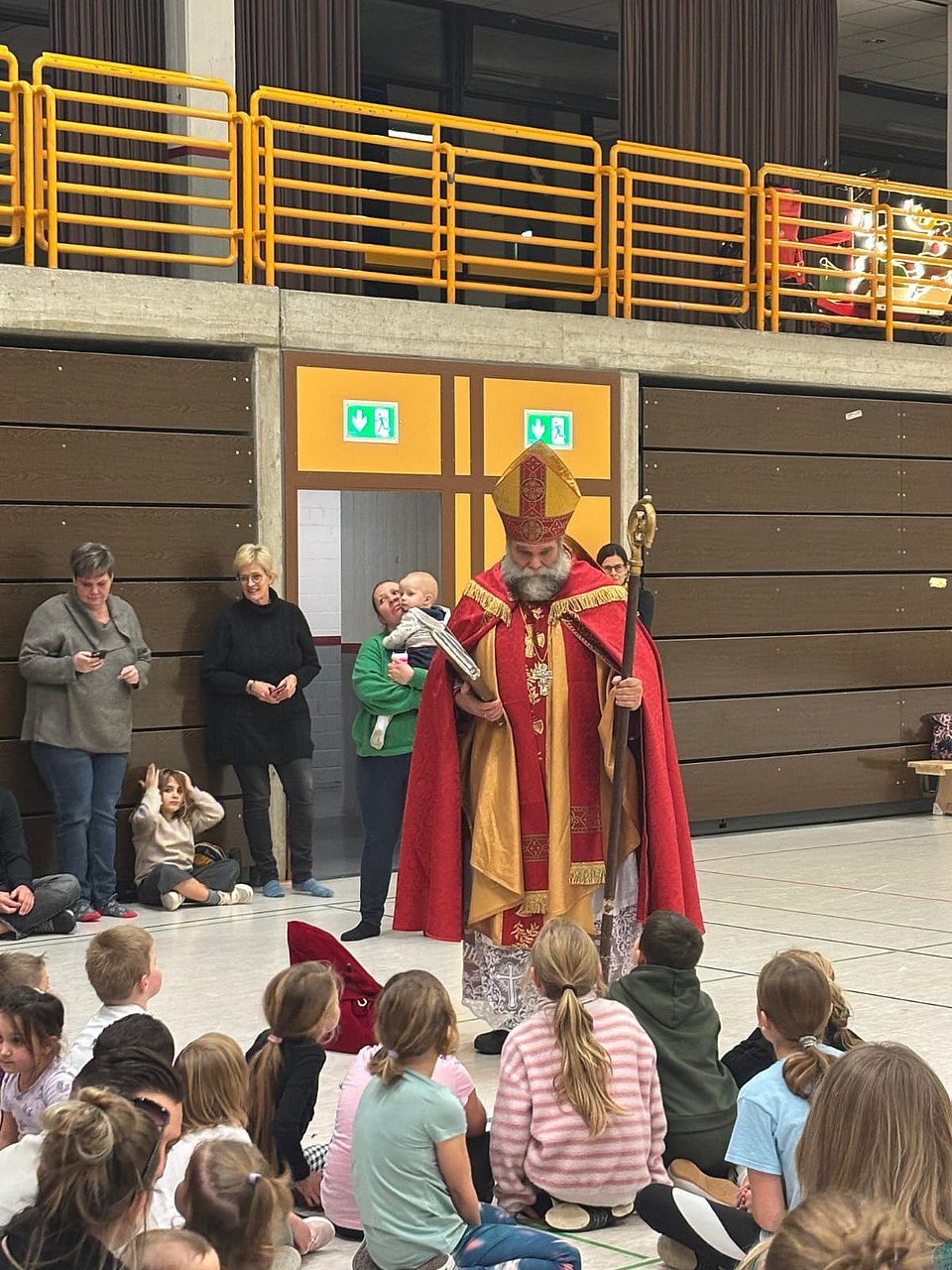 Zum Ende folgte der Höhepunkt: der Überraschungsbesuch des Nikolaus. Als er die Halle von oben betrat und hinunterblickte, machte sich große Aufregung breit – die Freude über den besonderen Gast war den Kindern deutlich anzusehen.