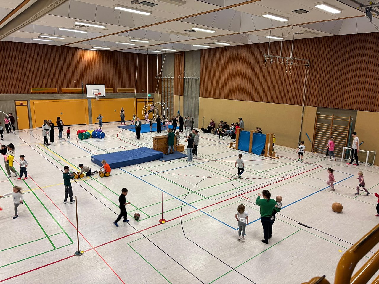 Der Nachmittag begann mit einem offenen Bewegungsangebot. Die Kleineren tobten begeistert durch den Parcours oder spielten mit Bällen, Ringen, Seilchen und was sonst bereitlag. Die Älteren stürzten sich voller Eifer ins Chaos-Spiel und durchsuchten die Halle nach den versteckten Zahlen, die sie für ihre Aufgaben brauchten.