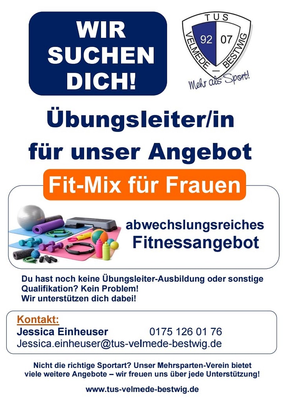 Unsere TuS-Turnabteilung sucht eine Übungsleiterin / einen Übungsleiter für das Angebot "Fit-Mix für Frauen". Interesse? Dann ist das Deine Chance!